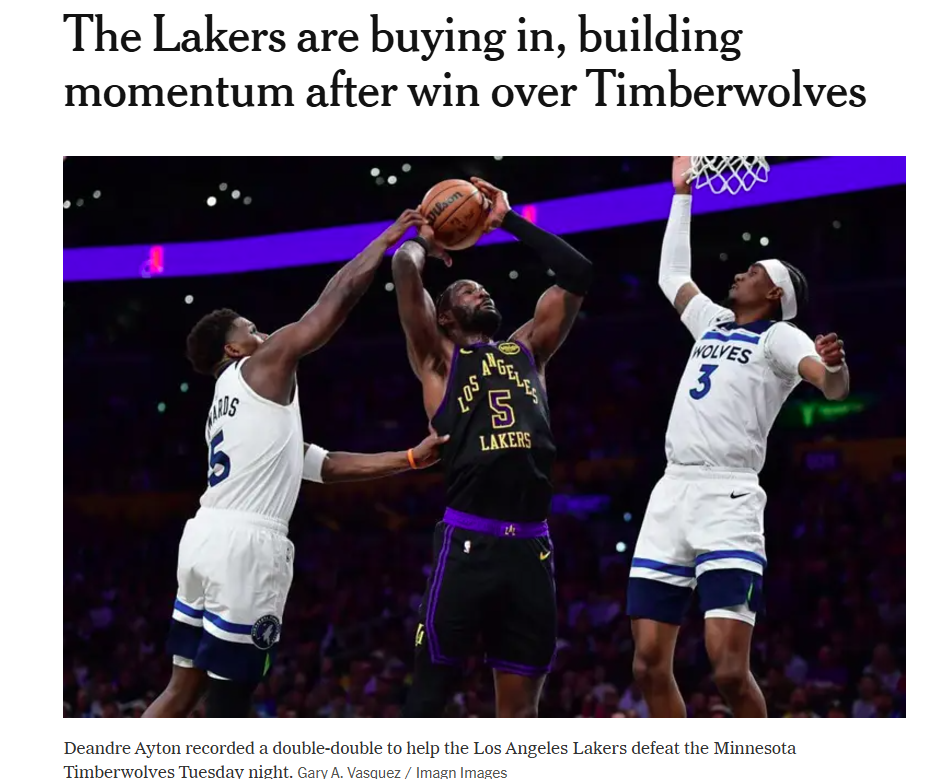 过去两场连斩尼克斯与森林狼的强强对话中,两人不仅强势带队拿下胜利,还解决了困扰湖人已久的防守问题。