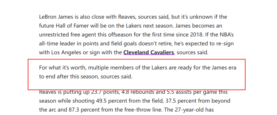 数名消息人士向其透露,湖人内部多名成员已经做好了本赛季后迎接詹姆斯时代终结的准备。